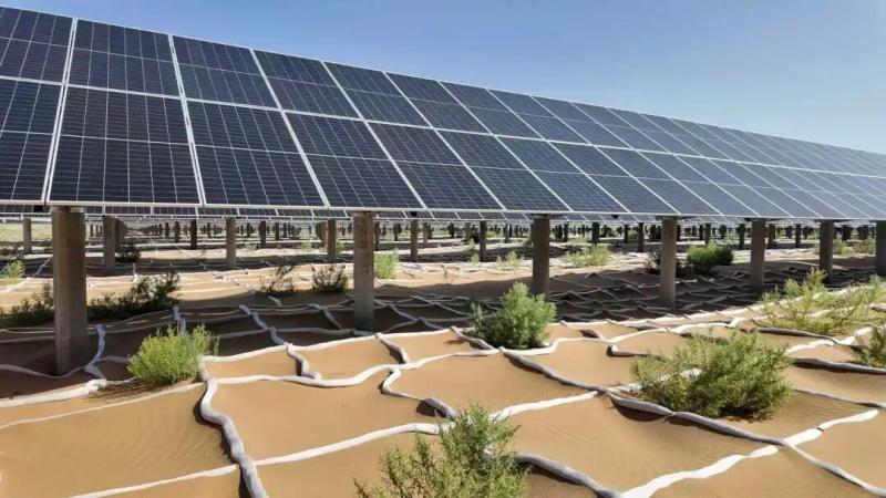 在內(nèi)蒙古華電騰格里清潔能源外送基地,建成的200萬千瓦光伏項(xiàng)目正將清潔能源輸送入網(wǎng)。該項(xiàng)目因地制宜采用“光伏+治沙”的形式,通過板上發(fā)電、板下修復(fù)、板間種植,在治理沙地的同時(shí)促進(jìn)節(jié)能降耗,實(shí)現(xiàn)生態(tài)、經(jīng)濟(jì)效益的有機(jī)統(tǒng)一。