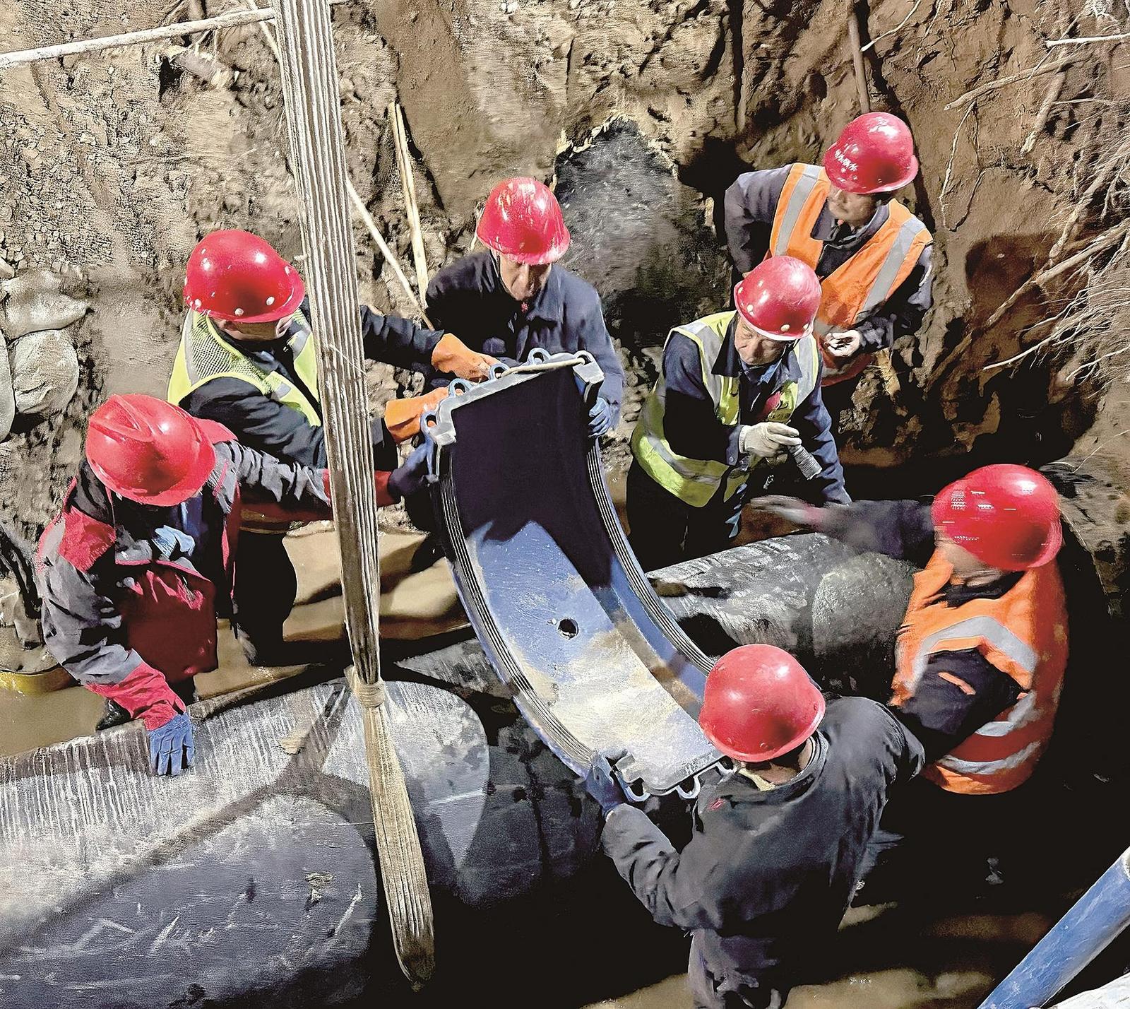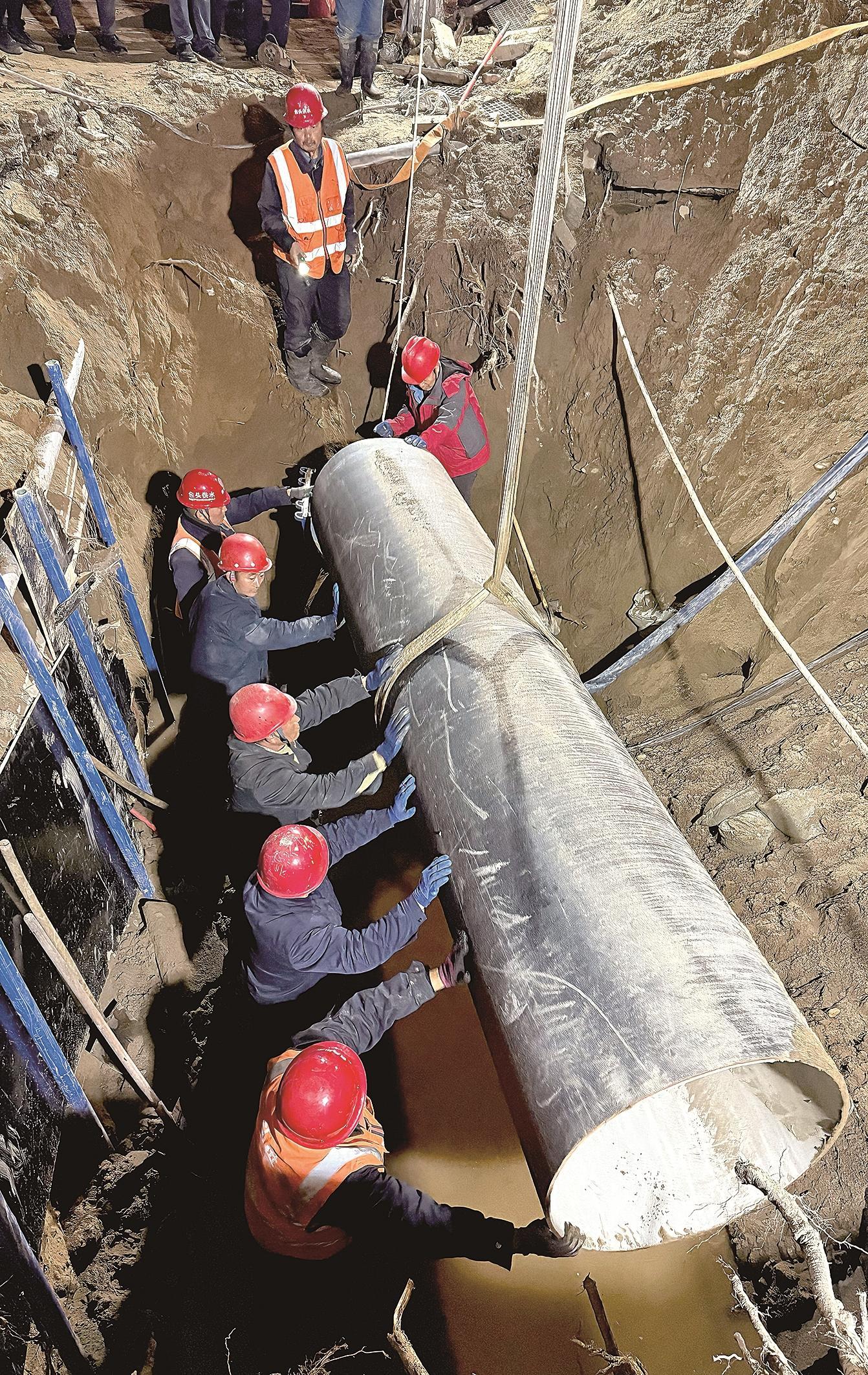 夜色漸深,氣溫持續(xù)下降,搶修現(xiàn)場(chǎng)卻燈火通明、熱火朝天。挖掘、排水、清理、焊接……每一個(gè)環(huán)節(jié)都爭(zhēng)分奪秒,井然有序。黨員干部沖鋒在前,帶頭跳入泥水中作業(yè);其他維修人員輪番上陣,困了就在工程車(chē)?yán)锊[一會(huì)兒,餓了就蹲在路邊匆匆扒幾口盒飯。頂風(fēng)冒雨的兩個(gè)日夜,他們心中只有一個(gè)信念:早一分鐘修復(fù),市民就早一分鐘恢復(fù)正常用水,城市秩序就早一分鐘恢復(fù)。