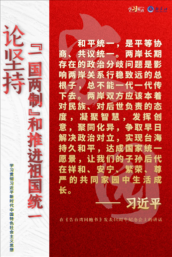 解決臺灣問題、實現(xiàn)祖國完全統(tǒng)一,是中國共產黨矢志不渝的歷史任務,是全體中華兒女的共同愿望,是實現(xiàn)中華民族偉大復興的必然要求。必須堅持貫徹新時代黨解決臺灣問題的總體方略,牢牢把握兩岸關系主導權和主動權,堅定不移推進祖國統(tǒng)一大業(yè)。