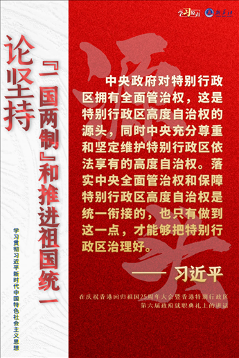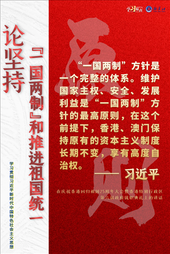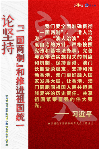 “一國兩制”是黨領導人民實現(xiàn)祖國和平統(tǒng)一的一項重要制度,是國家的一項基本國策。中國特色社會主義進入了新時代,意味著“一國兩制”事業(yè)也進入了新時代。不斷推進“一國兩制”在香港、澳門的成功實踐,是中華民族偉大復興歷史進程的重要組成部分。