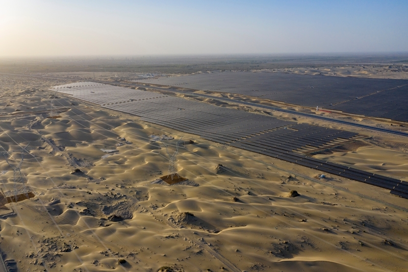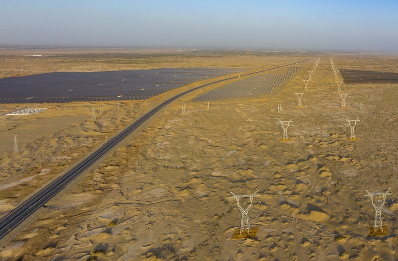 9月22日在新疆巴音郭楞蒙古自治州若羌縣拍攝的中國(guó)綠發(fā)新疆中綠電若羌400萬(wàn)千瓦光伏項(xiàng)目(無(wú)人機(jī)照片)。該項(xiàng)目每年可發(fā)電69.08億千瓦時(shí),滿足南疆200萬(wàn)戶家庭用電需求,減排208.24萬(wàn)噸煤耗。