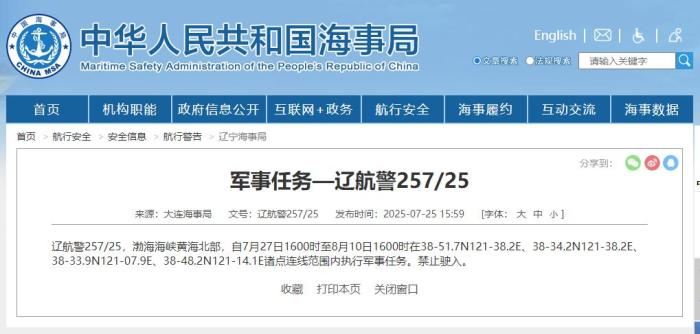 據(jù)中國(guó)海事局網(wǎng)站消息,大連海事局發(fā)布航行警告,7月27日16時(shí)至8月10日16時(shí),渤海海峽黃海北部部分海域執(zhí)行軍事任務(wù),禁止駛?cè)搿?/p>