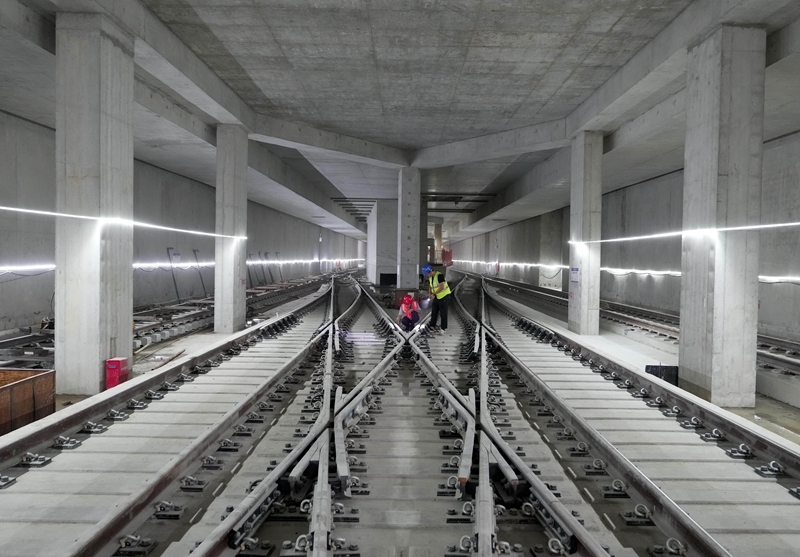 9月9日,工人在石家莊地鐵4號(hào)線一期工程?hào)|垣東路站建設(shè)工地施工。