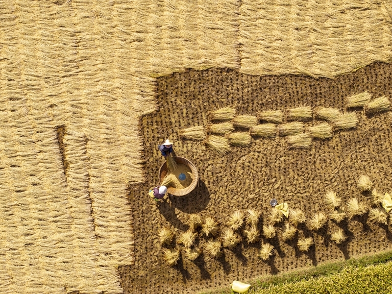 10月3日,農(nóng)民在云南省大理白族自治州洱源縣右所鎮(zhèn)收割水稻(無人機照片)。