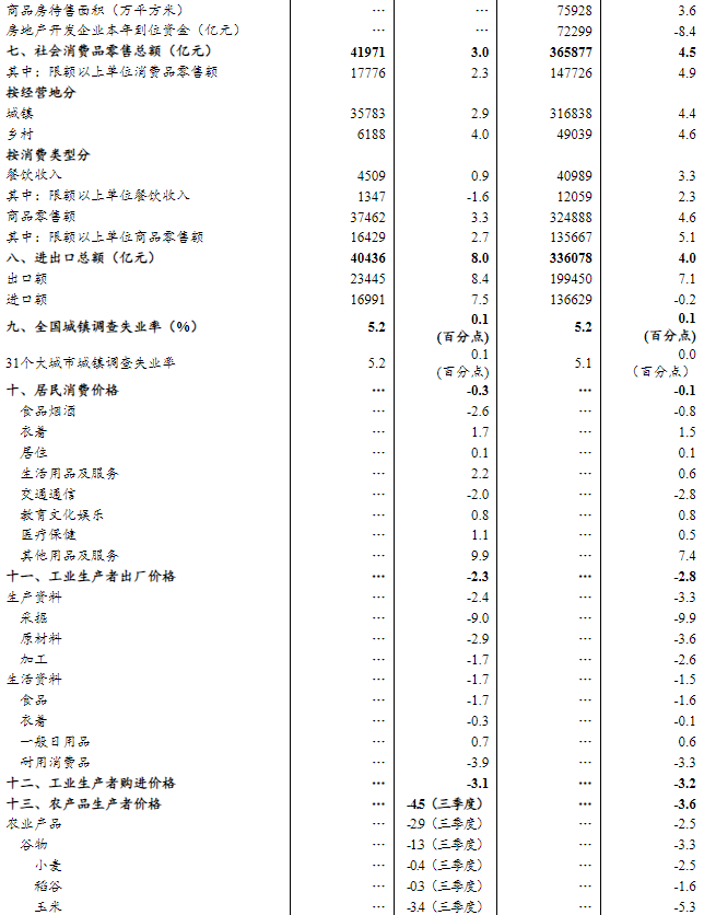 總的來(lái)看,前三季度穩(wěn)就業(yè)穩(wěn)經(jīng)濟(jì)政策舉措接續(xù)發(fā)力,主要宏觀指標(biāo)總體平穩(wěn),經(jīng)濟(jì)運(yùn)行保持穩(wěn)中有進(jìn)態(tài)勢(shì),高質(zhì)量發(fā)展取得積極成效。也要看到,當(dāng)前經(jīng)濟(jì)運(yùn)行仍面臨不少風(fēng)險(xiǎn)挑戰(zhàn),外部不穩(wěn)定不確定因素較多,國(guó)內(nèi)經(jīng)濟(jì)回升向好基礎(chǔ)仍需加力鞏固。下階段,要堅(jiān)持以習(xí)近平新時(shí)代中國(guó)特色社會(huì)主義思想為指導(dǎo),全面貫徹落實(shí)黨中央決策部署,堅(jiān)持穩(wěn)中求進(jìn)工作總基調(diào),推動(dòng)更加積極有為的宏觀政策落地增效,著力穩(wěn)就業(yè)、穩(wěn)企業(yè)、穩(wěn)市場(chǎng)、穩(wěn)預(yù)期,扎實(shí)推動(dòng)高質(zhì)量發(fā)展,促進(jìn)經(jīng)濟(jì)持續(xù)健康發(fā)展。