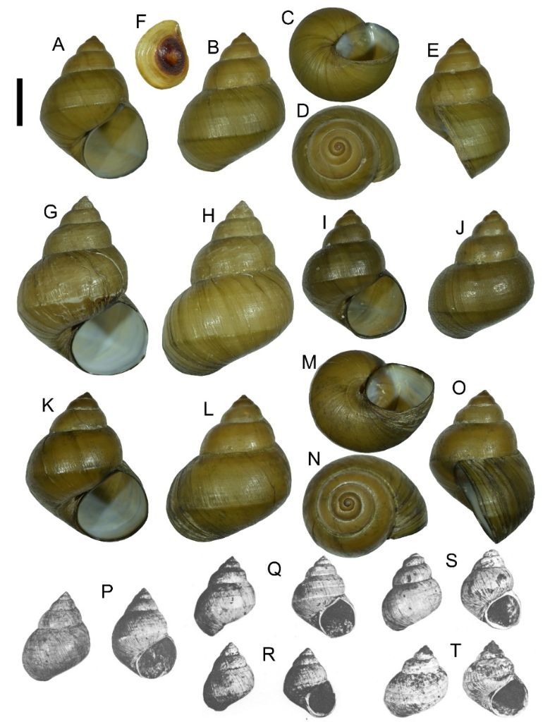 李四光婭田螺的現(xiàn)生個體貝殼(A—O)以及發(fā)現(xiàn)于第四紀(jì)沉積層的貝殼模式標(biāo)本(P—T)。(中國科學(xué)院昆明動物研究所東南亞野生動物多樣性課題組供圖)