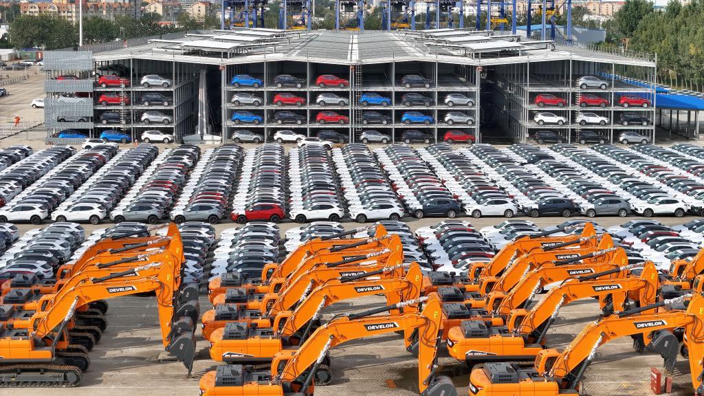 △山東港口煙臺(tái)港,國產(chǎn)汽車和工程機(jī)械集結(jié)等待裝船出口。