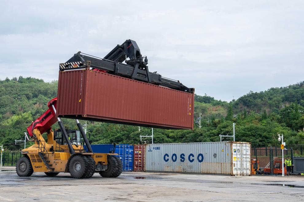 6月20日,在株洲中車(chē)物流園,工作人員在進(jìn)行集裝箱裝車(chē)作業(yè)。新華社記者陳思汗攝