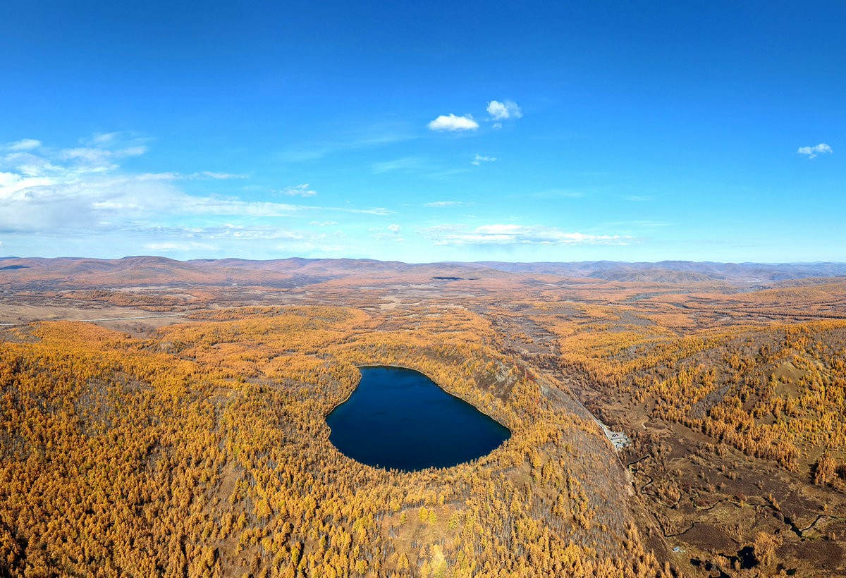 9月29日,空中視角下的內(nèi)蒙古阿爾山國(guó)家森林公園天池山天池 北疆新聞?dòng)浾?張楊攝影