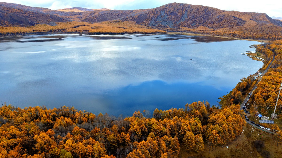 9月29日,空中視角下的內(nèi)蒙古阿爾山國(guó)家森林公園杜鵑湖 北疆新聞?dòng)浾?張楊攝影