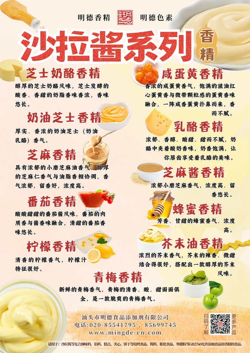 明德沙拉醬系列香精 多樣沙拉醬風味 適配多類食品工廠汕頭市明德食品添加劑有限公司推出的沙拉醬系列香精,涵蓋芝士、蛋黃、芝麻、果蔬及特色風味,適用于調(diào)味醬、焙烤制品、休閑食品等多個工業(yè)應用場景,助力B端工廠實現(xiàn)風味的穩(wěn)定性與差異化,讓產(chǎn)品在市場中脫穎而出。